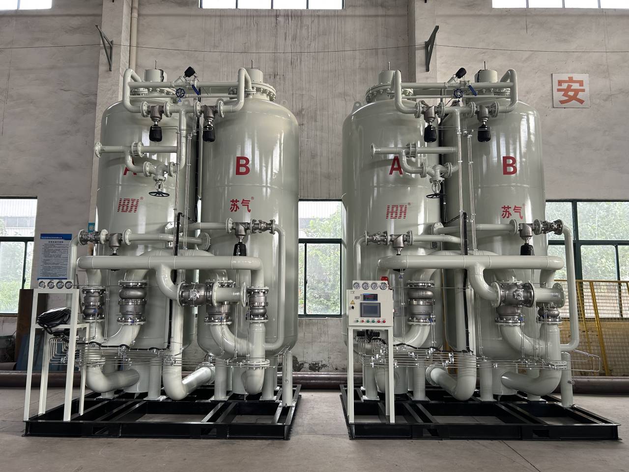 環(huán)境空氣經(jīng)壓縮凈化,除去油、水、塵后,進(jìn)入由兩個(gè)裝填有碳分子篩的吸附塔組成的變壓吸附裝置。壓縮空氣由下至上流經(jīng)吸附 塔,其間氧分子在碳分子篩表面吸附,氮?dú)庥晌剿隙肆鞒?,進(jìn)入粗氮緩沖罐,經(jīng)過一段時(shí)間后,吸附塔中碳分子篩被吸附的氧飽和,需進(jìn)行再生。再生是通過停止吸附步驟,降低吸附塔壓力來(lái)實(shí)現(xiàn)的。兩個(gè)吸附塔交替進(jìn)行吸附和再生,從而確保氮?dú)獾倪B續(xù)輸出。